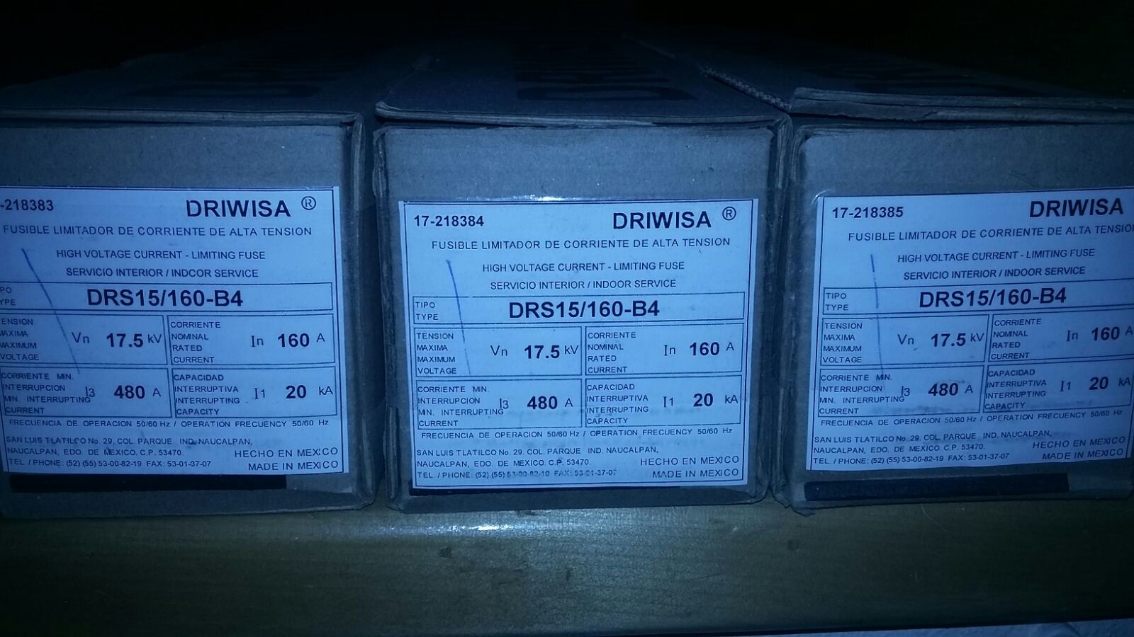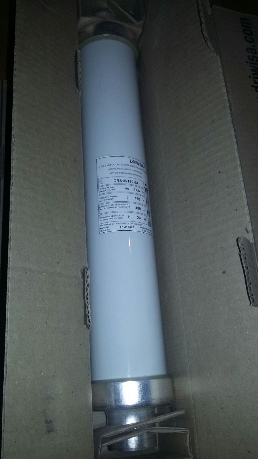 Fusible Limitador de Corriente de Alta Tension C/Percutor Servicio Interior, Cat. DRS15/160-A4, Voltaje 17.5kV, Corriente Nominal 200A, Largo 508mm, Precio c/IVA, entrega en nuestro Almacen, no incluye fletes ni maniobras.
